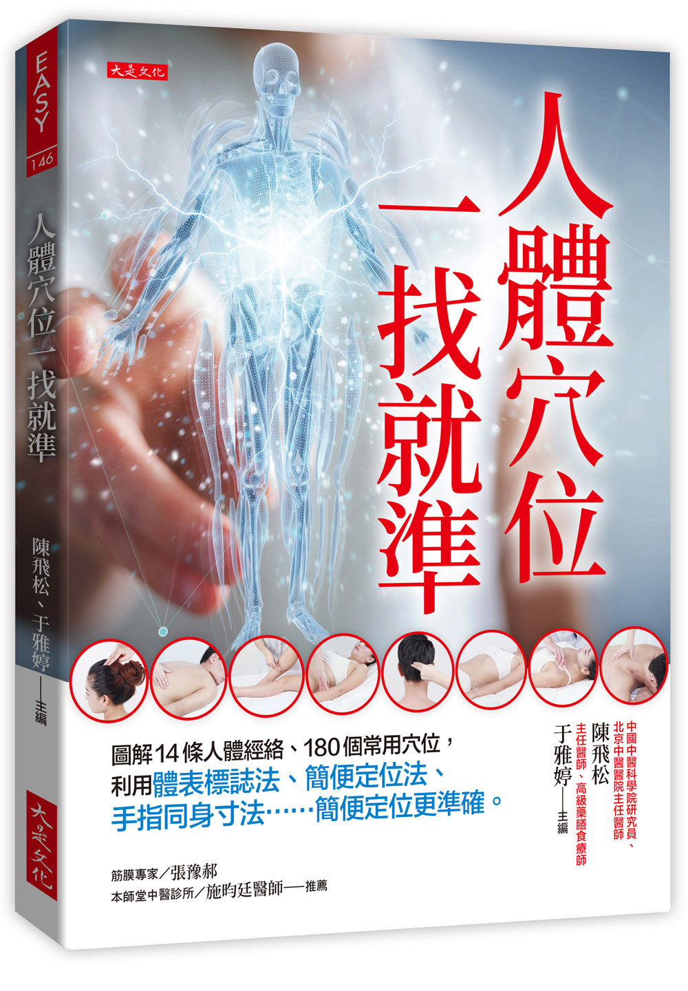 书名简译:人体穴位一找就准:图解14条人体经络、180个常用穴位,利用体表标志法、简便定位法、手指同身寸法……简便定位更准确。